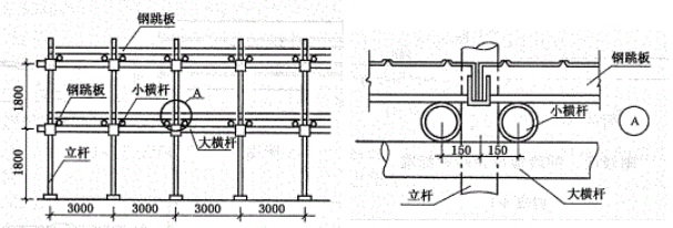 第4.0.2條鋼跳板的鋼管小橫桿(2m小橫桿)的最大間距為1.5m,鋼跳板接頭處必須安裝兩根小橫桿,其相互距離應(yīng)不大于0.3m,鋼跳板端部懸出部分應(yīng)不大于0.15m(如附錄五所示)。當(dāng)未全部固定前,嚴(yán)禁鋪設(shè)鋼跳板。