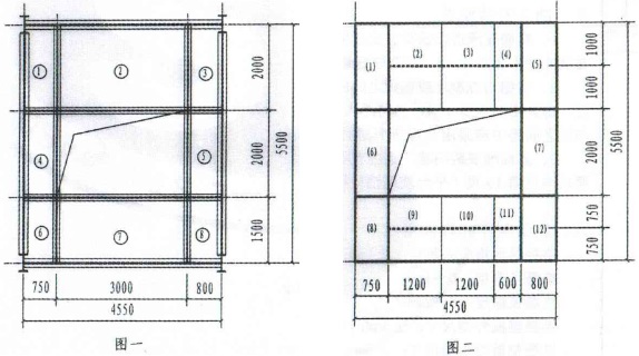 3、根據38厚玻璃鋼格柵板的整板外型尺寸進行平臺格柵平面布置,如圖二所示(含對角細實線的方格表示一塊板)共分為12塊板,各板型號如下: