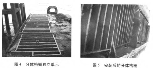 密集格柵的拆換需要氣割處理,耗時較長,若密集格柵的頻繁拆裝,將嚴重浪費施工時間。所以密集型格柵多采用活動格柵,即整個密集格柵由4塊獨立單元組成,在每個單元四角鉆孔,用于固定,然后再在耙頭內側對應的位置焊好帶孔的基座,最后將4塊格柵分別用螺栓與對應的基座固定(圖4、5)。采用活動的密集格柵,拆裝時間將大大縮短。